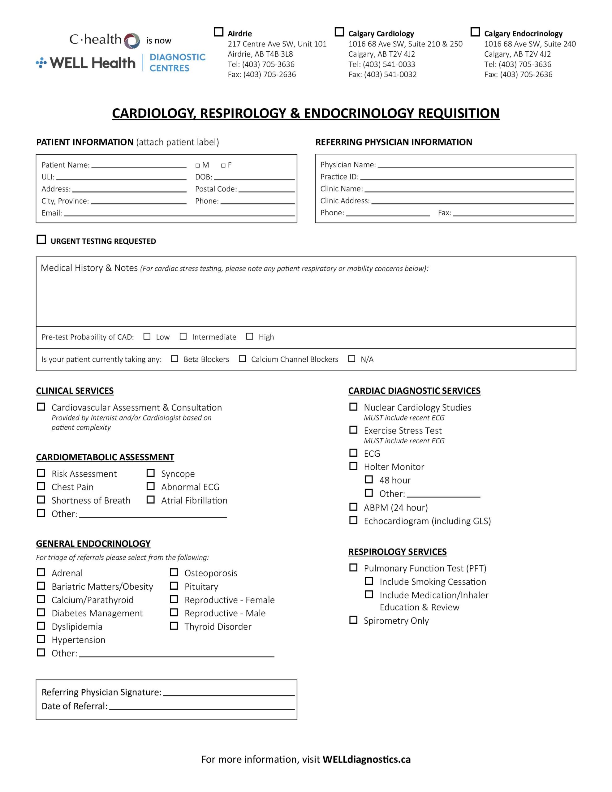 If you are a patient, please click on your region below to download a PDF requisition and obtain a signed copy from your referring healthcare provider*. Then CLICK HERE to find your nearest WELL Health Diagnostic Centre with contact information.